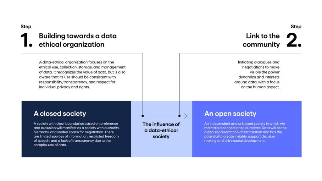 The first step of data ethics is aimed at the individual organization. The second step aims to achieve a connection with society.