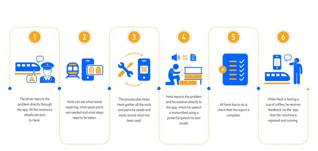 One of our last projects illustrates how generative AI tool can be harnessed to improve productivity: We have been working with the maintenance department of a local public transport organization to improve the workflow of their busy mechanics. The job of a mechanic is critical to keeping the fleet operational. Repairs and maintenance must be performed swiftly and adeptly so that services are not interrupted and so that unplanned maintenance is avoided. A major workflow bottleneck we have identified was the time-consuming reporting process: Mechanics must interact with a cumbersome interface to obtain the needed information for each maintenance job and then report on their findings and actions in a clear, succinct, but also informative manner.