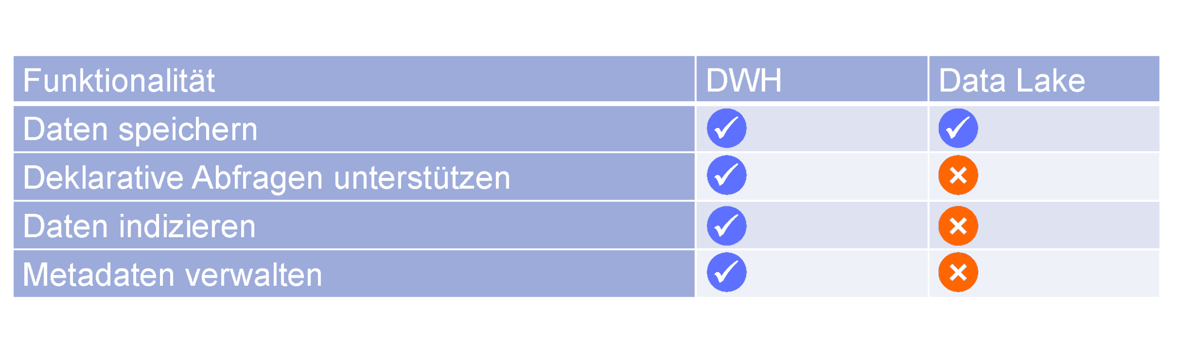The data and the data structures of a DWH can be specifically queried and changed with SQL – the files in a data lake cannot be so far. This possibility of targeted querying and modification is central for robust ETL or ELT processes for data integration and for efficient historization, i.e., for core tasks of data collection.