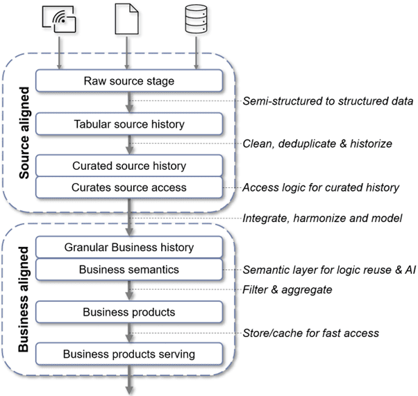 - Curated source access: A specific layer to manage data access and may consist of (dynamic) views and/or have specific logic for fine-grained access control to source-aligned data. It really depends on requirements and technology used if such a layer makes sense so I put it here simply for inspiration.