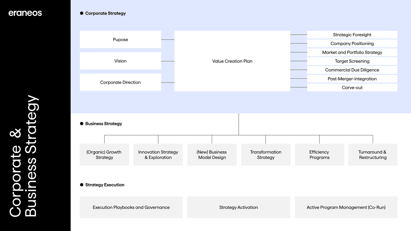 At Eraneos, Corporate & Business Strategy empowers sustainable growth and transformation through tailored strategies that align with market dynamics and organizational challenges. We support leaders in defining strategic direction, unlocking value, and ensuring the enterprise becomes more than the sum of its parts – through clarity, alignment, and a long-term perspective.